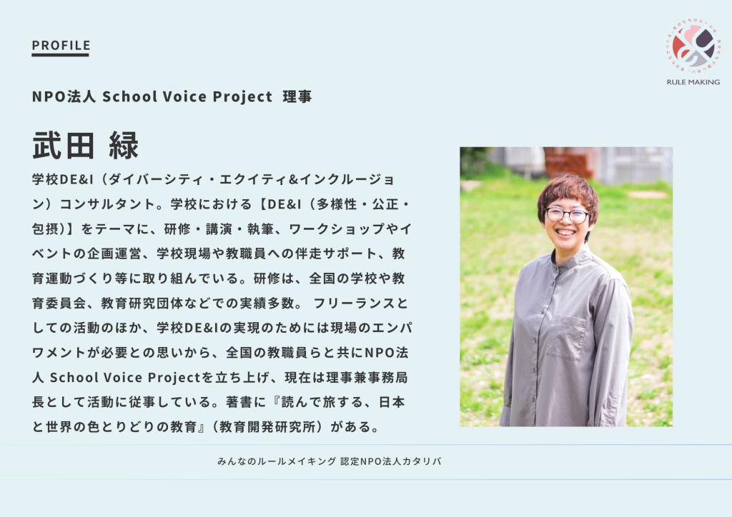 武田:ルールメイキングは、まだ「校則の見直し」というイメージが強い人もいると思います。私が担当するワークショップでは、校則に限らず学校の様々な場面において、自分たちの希望や違和感を大事にしながら、「それを声に出していいんだ」「自分たちで作っていけるんだ」ということを実感できる機会にしたいですね。